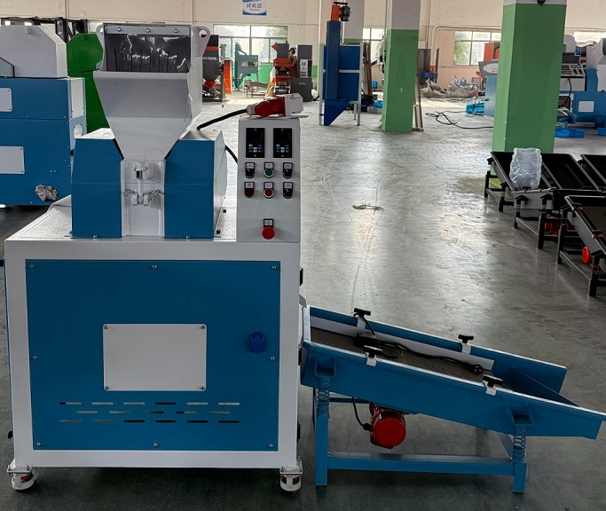 Broyeur Granulateur Séparateur Type : SOCO-STC02 Mini avec son convoyeur de sortie vibrant pour séparation des granulés cuivre gros ou fins